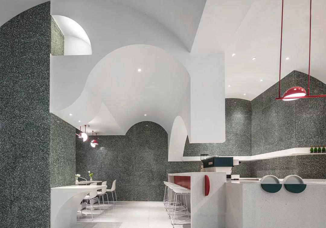 大面積的玻璃幕墻的介入,使空間得到一個(gè)很好的劃分,在水平方向上帶來(lái)了充足的自然光線。景觀與材料、大理石和光線的交接詮釋了人工與自然之間的碰撞,展示出整間甜品店的活力。