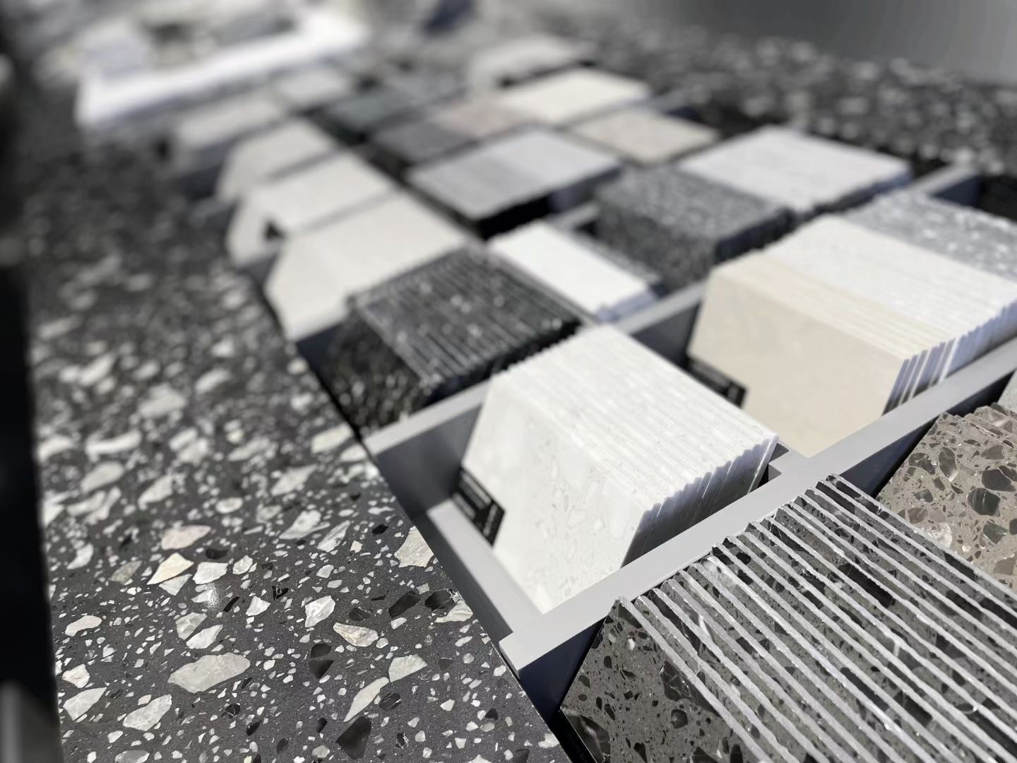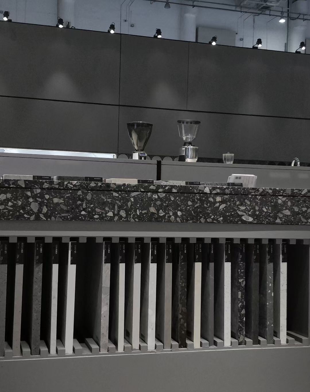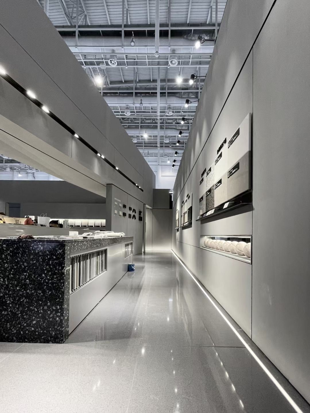 材質(zhì)與藝術(shù)裝置相容共生,完美融合于現(xiàn)代設(shè)計(jì)的主題館場(chǎng)景,骨料與材料的結(jié)合,自然與工業(yè)的融合,凸顯人造石板材陳列最好的視覺(jué)效果和百搭性。為參觀者營(yíng)造浸入式的藝術(shù)體驗(yàn),引導(dǎo)著訪(fǎng)者逐個(gè)探索品鑒中心里的每一個(gè)角落。
