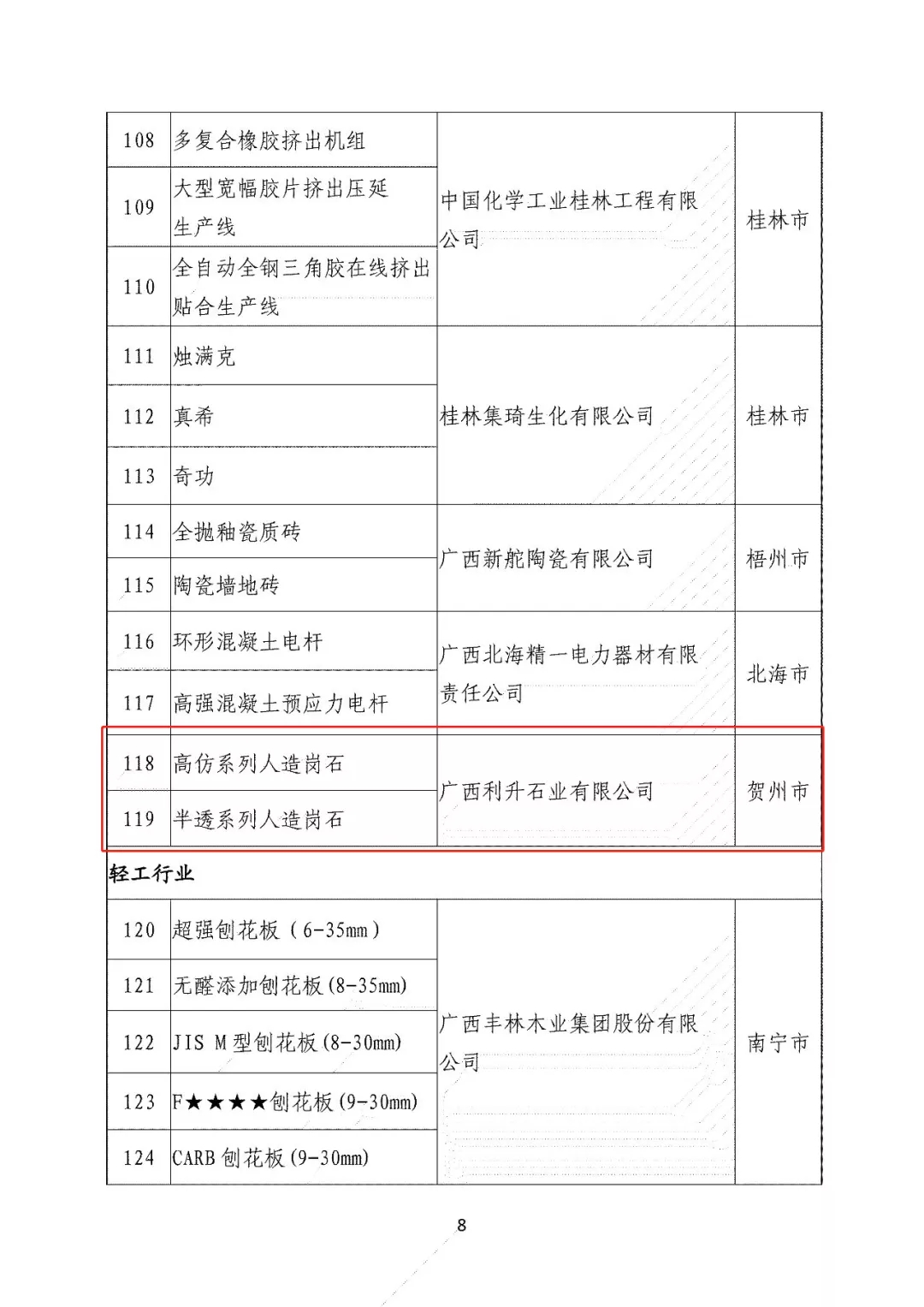近日,廣西壯族自治區(qū)工業(yè)和信息化廳發(fā)布公告,確定235個產(chǎn)品入選《廣西名優(yōu)工業(yè)產(chǎn)品推薦目錄》(第一批),涵蓋汽車、輕工、食品、醫(yī)藥、石材建材等9個行業(yè)。廣西利升石業(yè)有限公司以高仿系列人造崗石、半透系列人造崗石等產(chǎn)品成功入選。